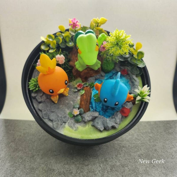 Deze royale Pocket Terra van 14 cm is ontworpen voor het ultieme trio: drie figuren uit dezelfde beginwereld, elk met hun eigen element en persoonlijkheid. Denk aan vuur, water, natuur – elk met een eigen flair, samengebracht in een landschap dat hun krachten weerspiegelt en versterkt.