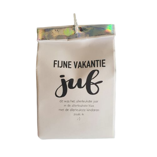 Een paper baggie en 4 verschillende leuke en lieve teksten voor de juf of meester. Liever een eigen tekst dit is ook mogelijk tegen meerprijs. Leuk verpakkings zakje met iets lekkers of leuks erin.