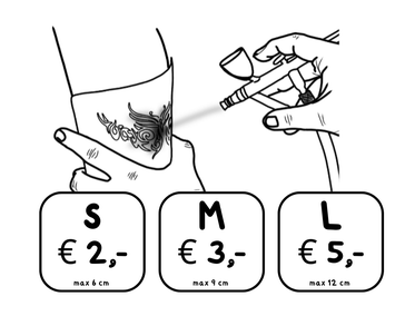 Wij gebruiken om een tijdelijke tatoeage te spuiten speciale verf. Dit is een hoog gepigmenteerde, niet giftige carrosserielak op alcoholbasis. Deze is water bestendigd en blijf gedurende 3 tot 5 dagen zitten. afhankelijk van de weersomstandigheden en jouw eigen huid type.